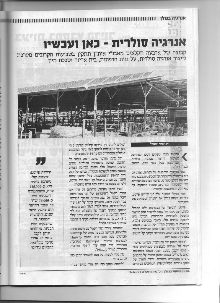 "מערכת נוספת אנחנו עומדים להתקין בנוב ויש מתעניינים נוספים מגבעת יואב ואליעד. מדובר בעיקר ברפתות, שעל הגג שלהן יש די מקום לאפשר הצבה אופטימלית של הלוחות".